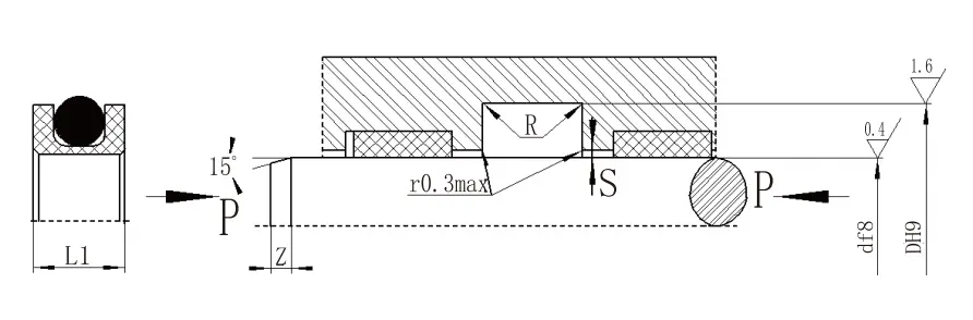 Forseglingshøjde L1 | Afrundede hjørner rmaks | Radial clearance smaks | Afskåret Zmin |