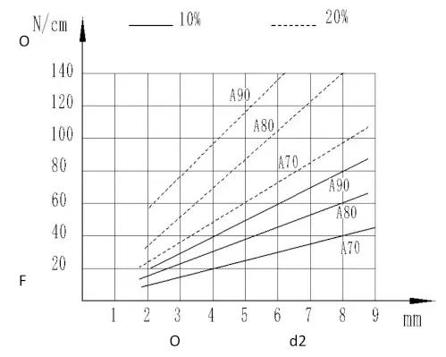 Under installationen er kompressionskraften relateret til graden af indledende komprimering og materialets hårdhed. Figuren viser forholdet mellem enhedskomprimeringskraft og tværsnitsdiameter pr. Centimeter af tætningsomkretsen, som bruges til at estimere størrelsen på kompressionskraften, når O-ringen installeres.