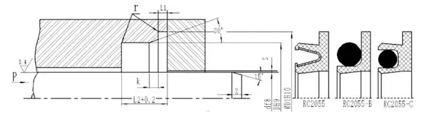 RC2055-C-40-PTFE4+R02 skaftdiameter er 40, forseglingsringmateriale er PTFE4, matchende O-ring er fluororubber